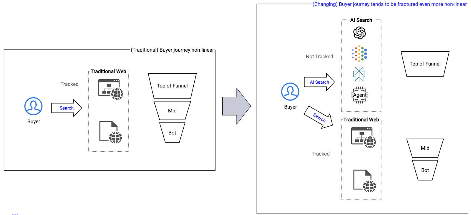 A subtle yet fundamental shift is quietly transforming the B2B buying landscape, altering how organizations engage with prospective buyers and redefining the buyer journey. The proliferation of LLM-based AI search engines such as Claude, Perplexity, and ChatGPT has shifted expectations toward rapid, precise responses rather than mere lists of blue links. These function as AI Answer Engines, providing summarized, relevant information directly to business users. Consequently, traditional website traffic, particularly from top-of-funnel prospects, diminishes as many queries are addressed by these AI solutions prior to engagement with vendor websites or intermediary agents.